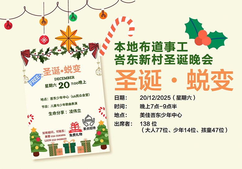 今年圣诞布道会定于十二月二十日晚上七点至九点,地点在峇东新村少年中心。讲员是信主前曾为茅山师父的凌伟立弟兄,以生命见证分享主的恩典。节目包括破冰活动、敬拜赞美、主日学学生及少年团契歌舞表演,小朋友在祝牧师与少年人的陪伴下学习耶稣降生故事与手工。我们也为有需要的家庭派送二十五份日常用品固本,并为所有出席者预备恩物与茶点。