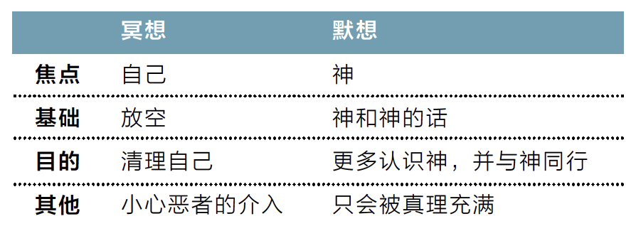 “诵读好比把食物放进口里,默想好比把食物咀嚼,祈祷带出食物的味道,默观表示食物的美味,使人心喜悦舒畅。”《隐修十楷模之言》