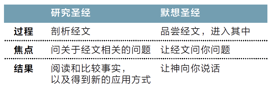 “默想”帮我把神的话读进到心,改变生命、心与情打开、被敞开;开始问神,与神对话。我要留意什么?神想我说什么?我的问题被解开,心被神医冶,神的话与我的生命产生共鸣。“祈祷”使我的“情、心、爱”去亲近神。我的心与意志与神的距离很近。我向神倾心吐意,不隐藏不保留。我向神说出自己的感受,我寻问神我会有的感受。