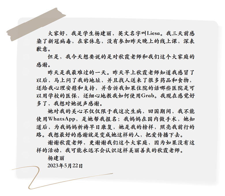 还有一位博士生,在疫情尾声来马时病得很重,身边无人照顾。秋霞得知后,立刻请Grab送去药物和食物,帮助她渡过难关。不久,她写来一封充满感恩的信,让秋霞感动不已。