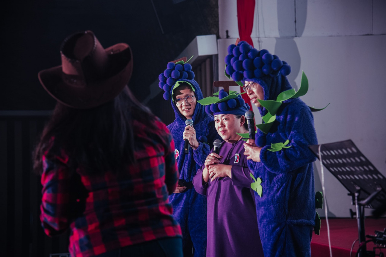 庆典首晚,三个身穿葡萄造型服饰的主持人“乐萄萄”、“萌萄萄”、“耗萄萄”登场,以轻松幽默的方式带领开幕仪式。随着敬拜赞美的旋律高扬,歌声如潮水般涌上心头,似乎直达天际。举手、祷告、微笑,现场充满圣灵的同在,让人深深体会到:当枝子连于葡萄树,生命的液汁就开始丰盛地流动。